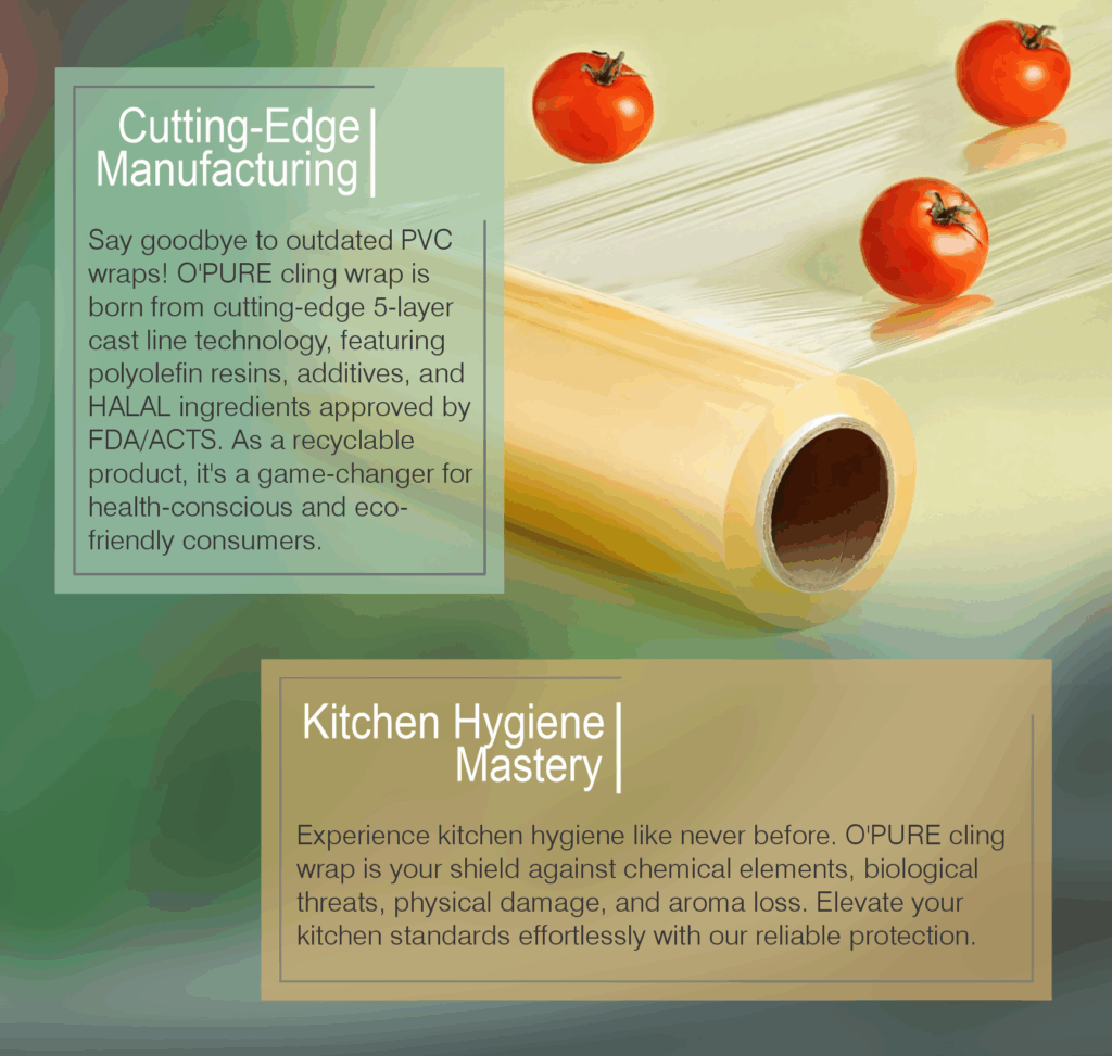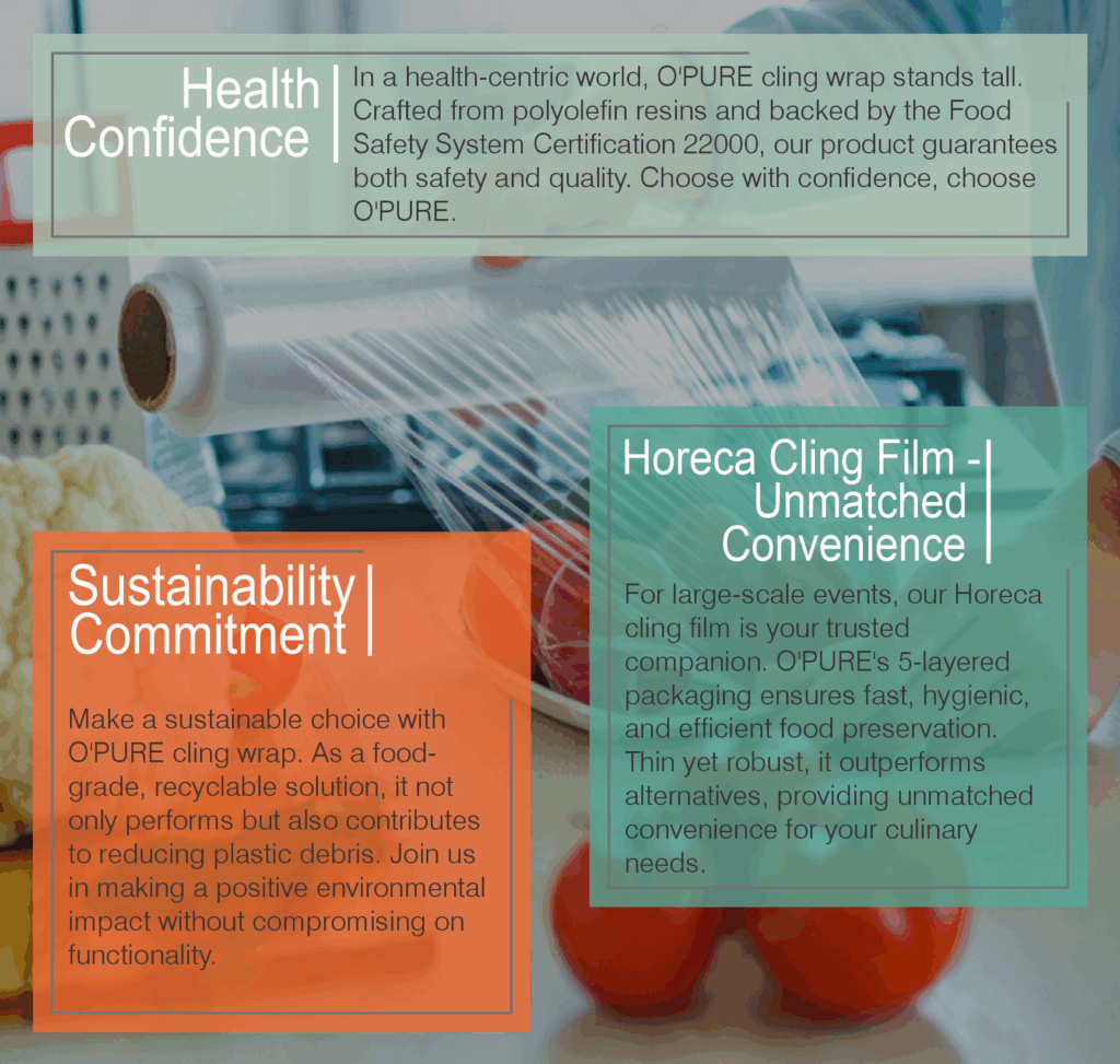 O PURE cling wrap is a food grade cling film rolls for a variety of purposes. It's manufacturing is based on 5-layer Co-Extrusion technology in line with world's top brands. It's strong cling and flexibility makes it ideal for covering dishes, selling food items preventing spills, preventing bacterial contamination and aroma less